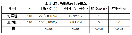1.3观察指标 观察对照组和观察组患者上环的成功率、上环操作时间、手术后出血时间以及术后并发症的发生率。