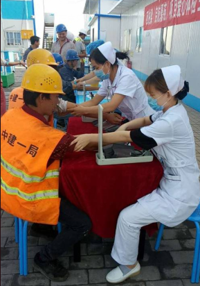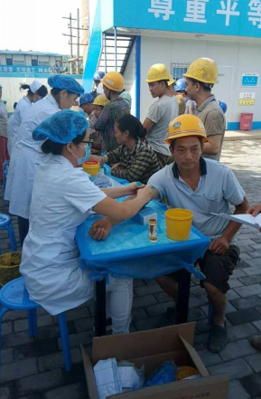 纪实回忆:6月20日上午,西安雁塔友好医院及中建一局联合开展“践行两学一做 送健康 送关怀 进工地 友好医院健康护平安”一期活动之关爱建筑工人进工地体检活动,在中建一局工地对500余名农民工进行为期数日的体检活动。